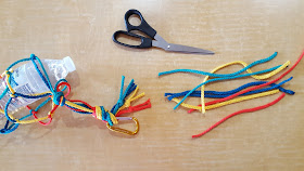 Materials: 4 different colors of Bonnie Craft Cord 4mm width (I found it at Hobby Lobby), 1 Biner per Cub Scout (Looking in the camping section for these), Tape measure, scissors, Lighter and a regular water bottle.